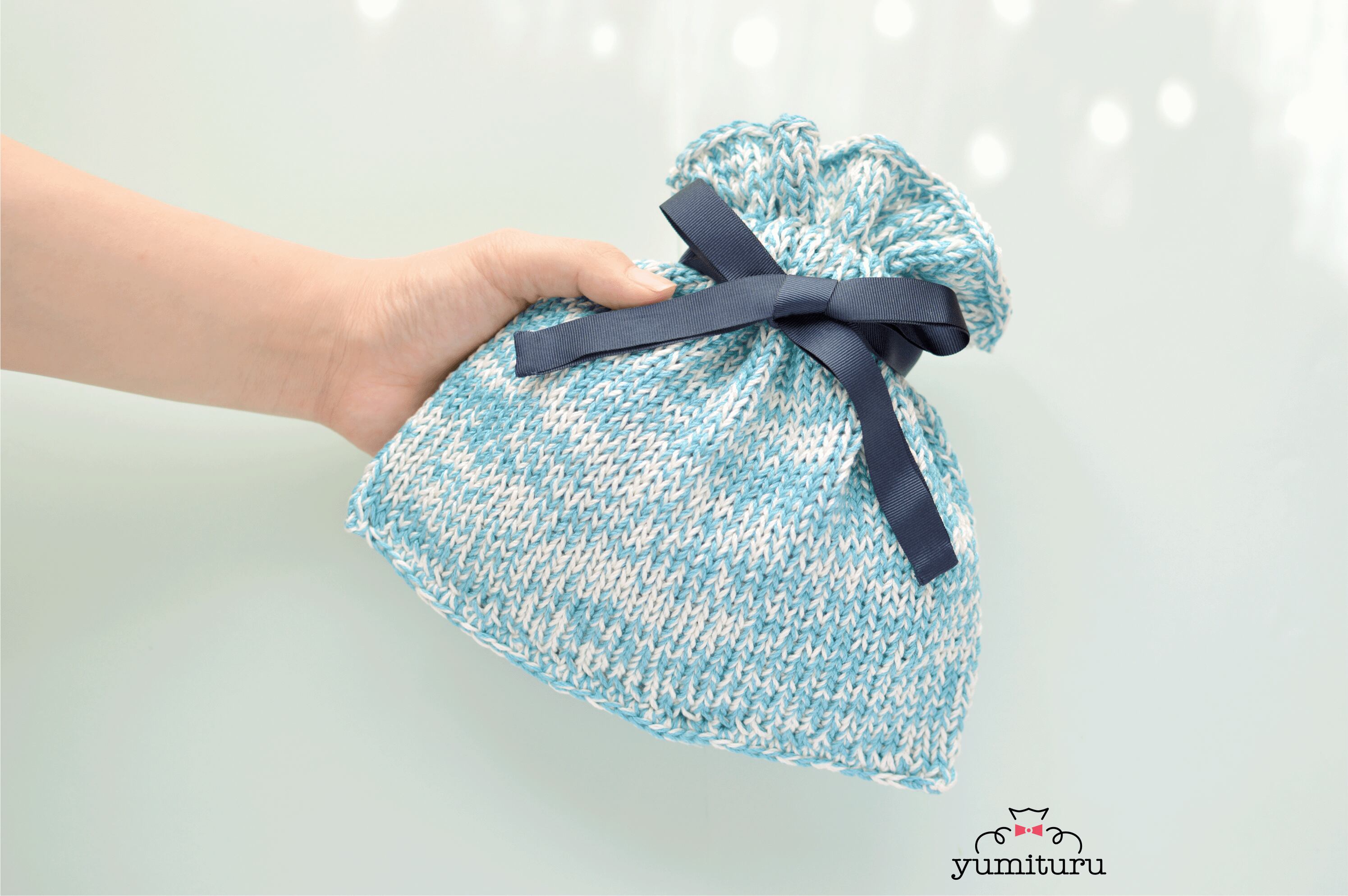つや感のあるブルーとホワイトの糸を混ぜて編みました。